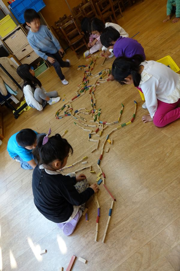 ドミノで迷路をつくっています。倒さないように、慎重に……