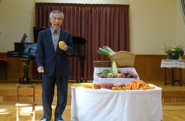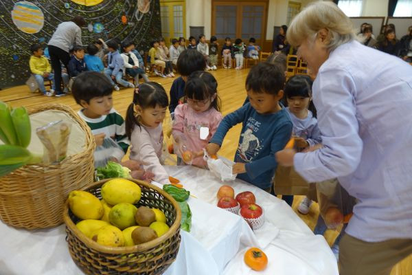 おうちから持ち寄った野菜や果物を飾り、神さまに感謝しました。